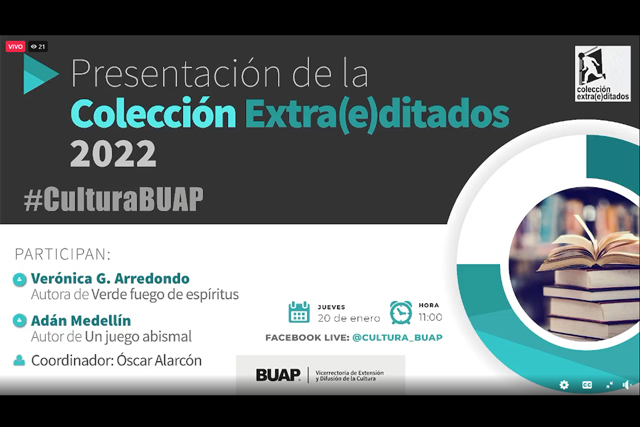 La Vicerrectoría de Extensión y Difusión de la Cultura (VEDC) de la BUAP, a través de la Dirección General de Publicaciones, anunció la colección Extra(e)ditados 2022, que este año reactiva sus trabajos de publicación con cinco autores contemporáneos de distintos estados del país, quienes encuentran en la literatura un canal idóneo para observar su entorno, cuestionarse y expresar su propia cosmovisión.